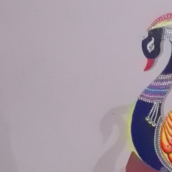 Add beauty and tradition to your home with this handcrafted peacock showpiece, made from premium wood and adorned with mirror and kundan work. Designed with a special ledge at the back to place god idols, candles, or decorative items, it can be easily kept on a table. The vibrant peacock design brings a festive and spiritual charm to any space, making it perfect for Diwali, pooja rooms, weddings, or gifting.